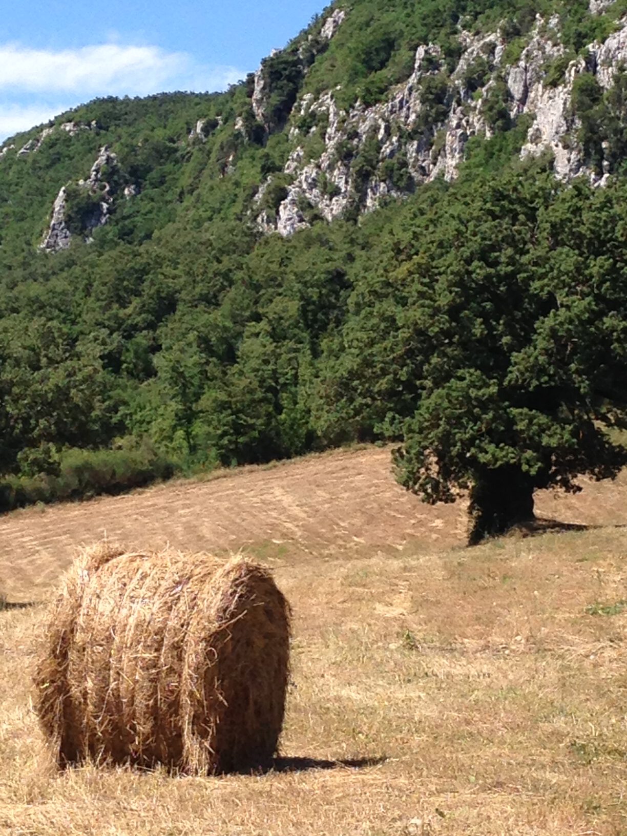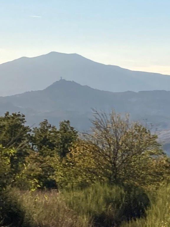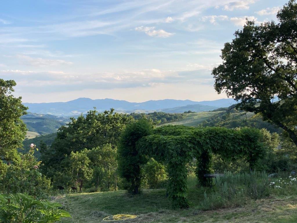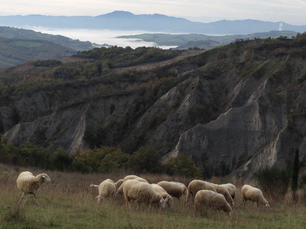 Der staunenswerte „Zauberwald“ mit Trüffelreservat stabilisiert das Klima und liefert Brennholz. Und Pilze. Die Felswand dahinter gehört zum Besitz; gegenüber beeindruckt eine scharfkantige Crete-Schlucht („calanche“); an ihr entlang geht der Blick über das Orcia-Tal hinweg in die tief gestaffelten toskanischen Hügelketten.