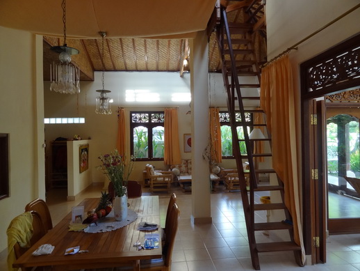 Die zweite Etage erreicht ihr über eine Wendeltreppe oder eine steile Innentreppe. Von dem Raum hat man eine wundervolle Aussicht über den Ort, die Reisfelder und den Tempel. Der 36m² große Raum kann für Yoga und Meditation und anderes verwendet.