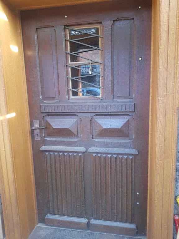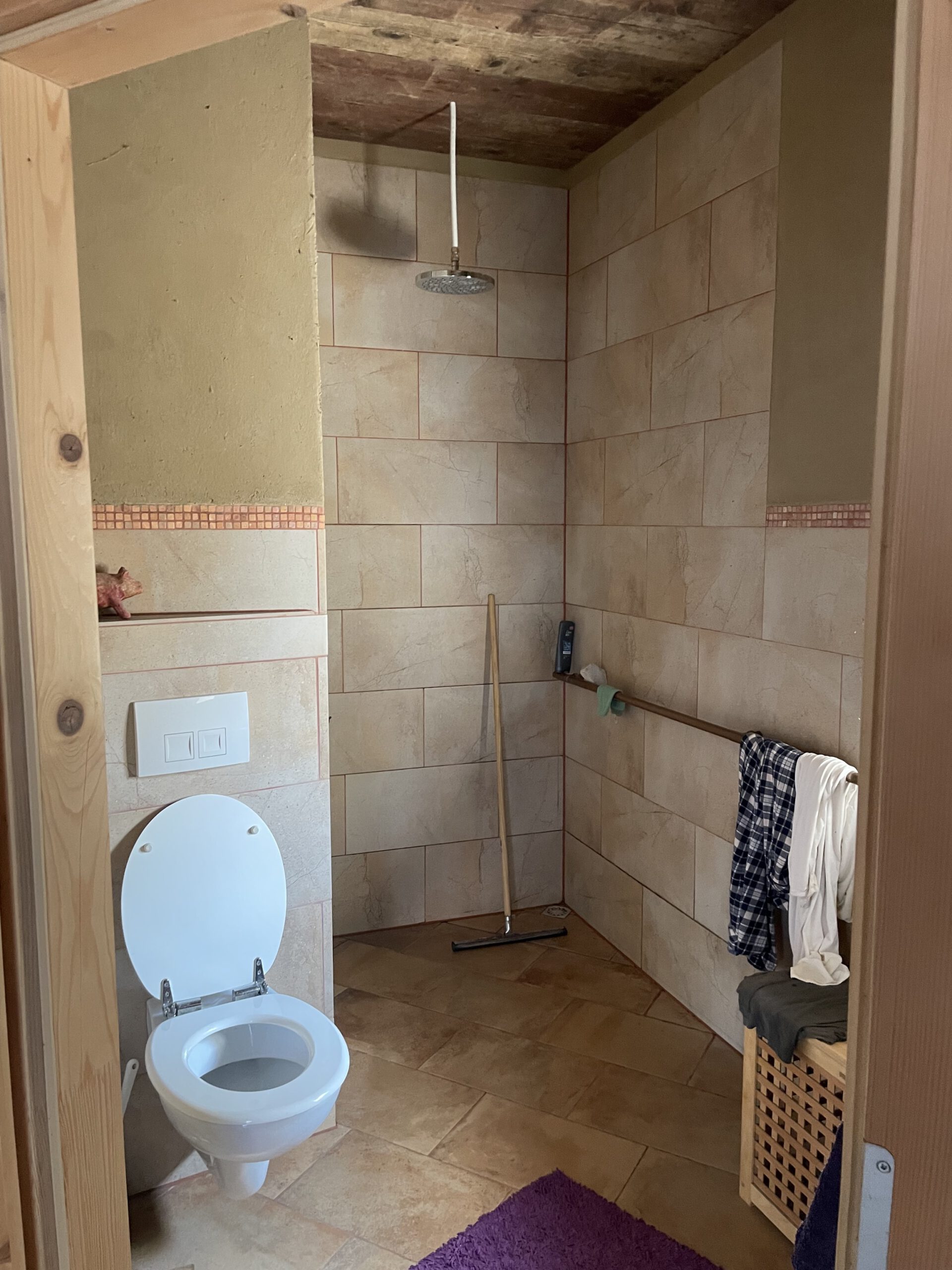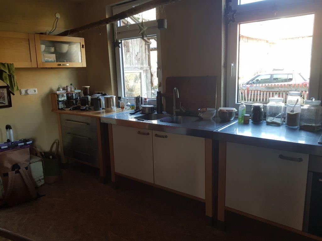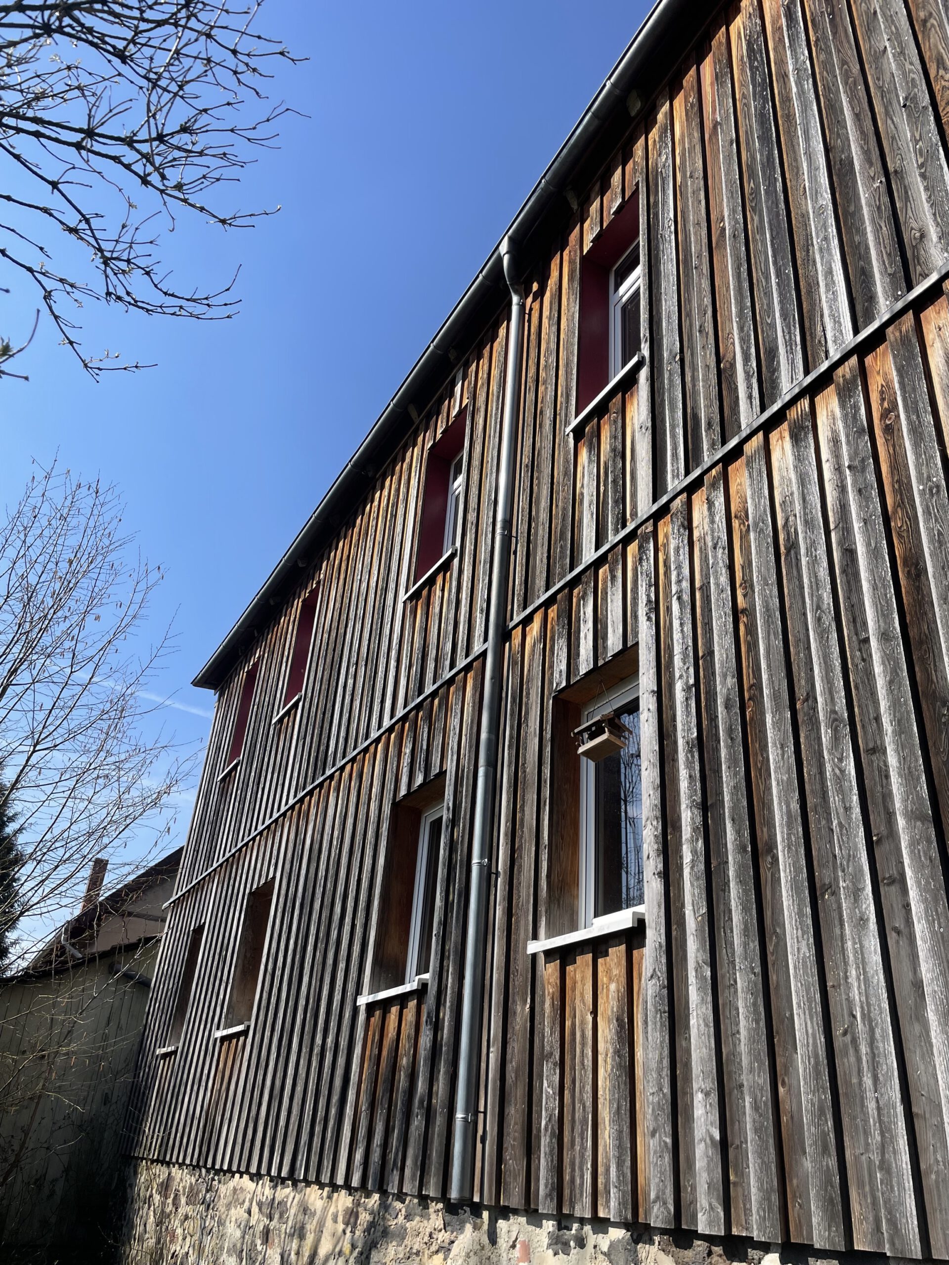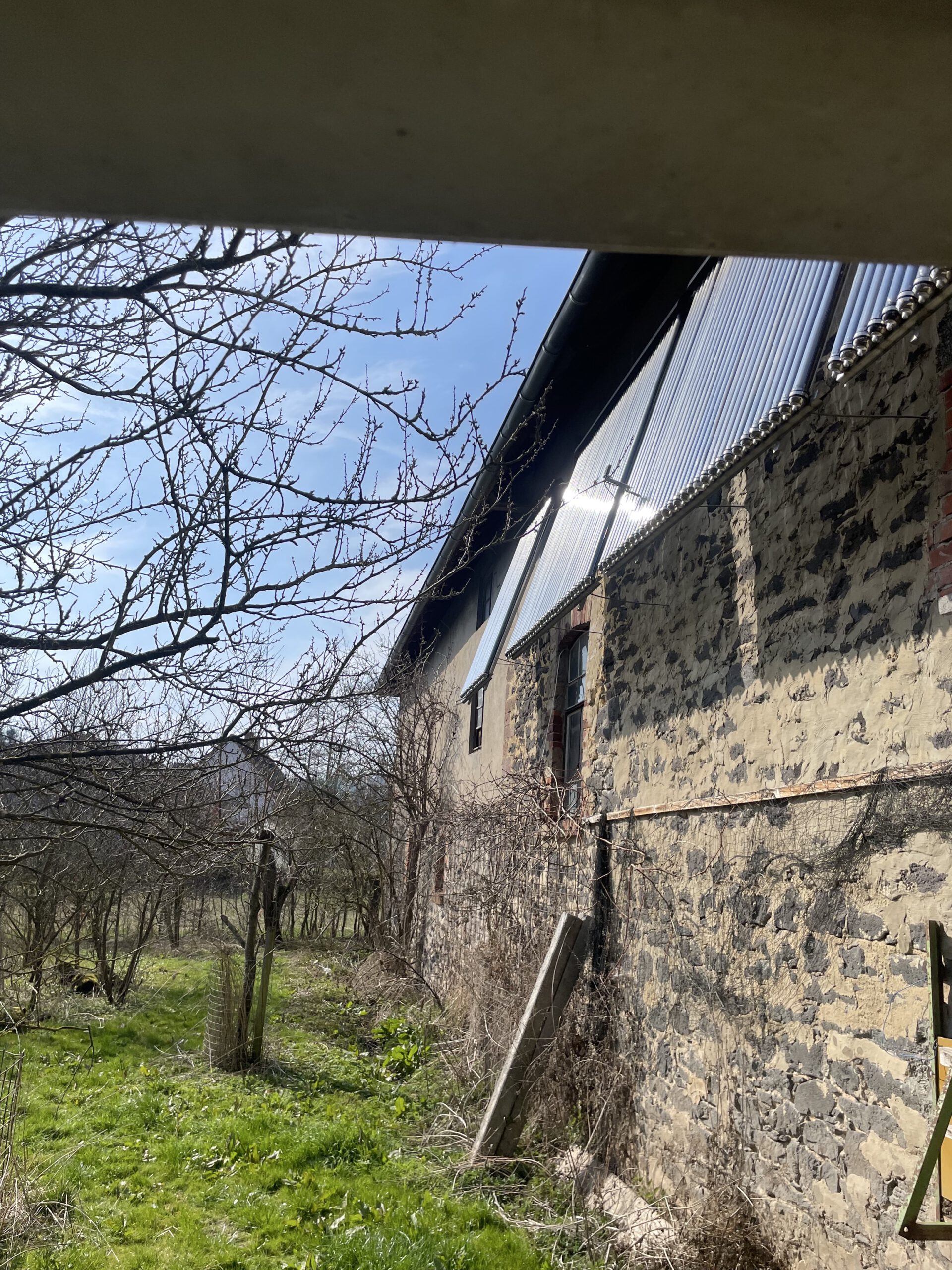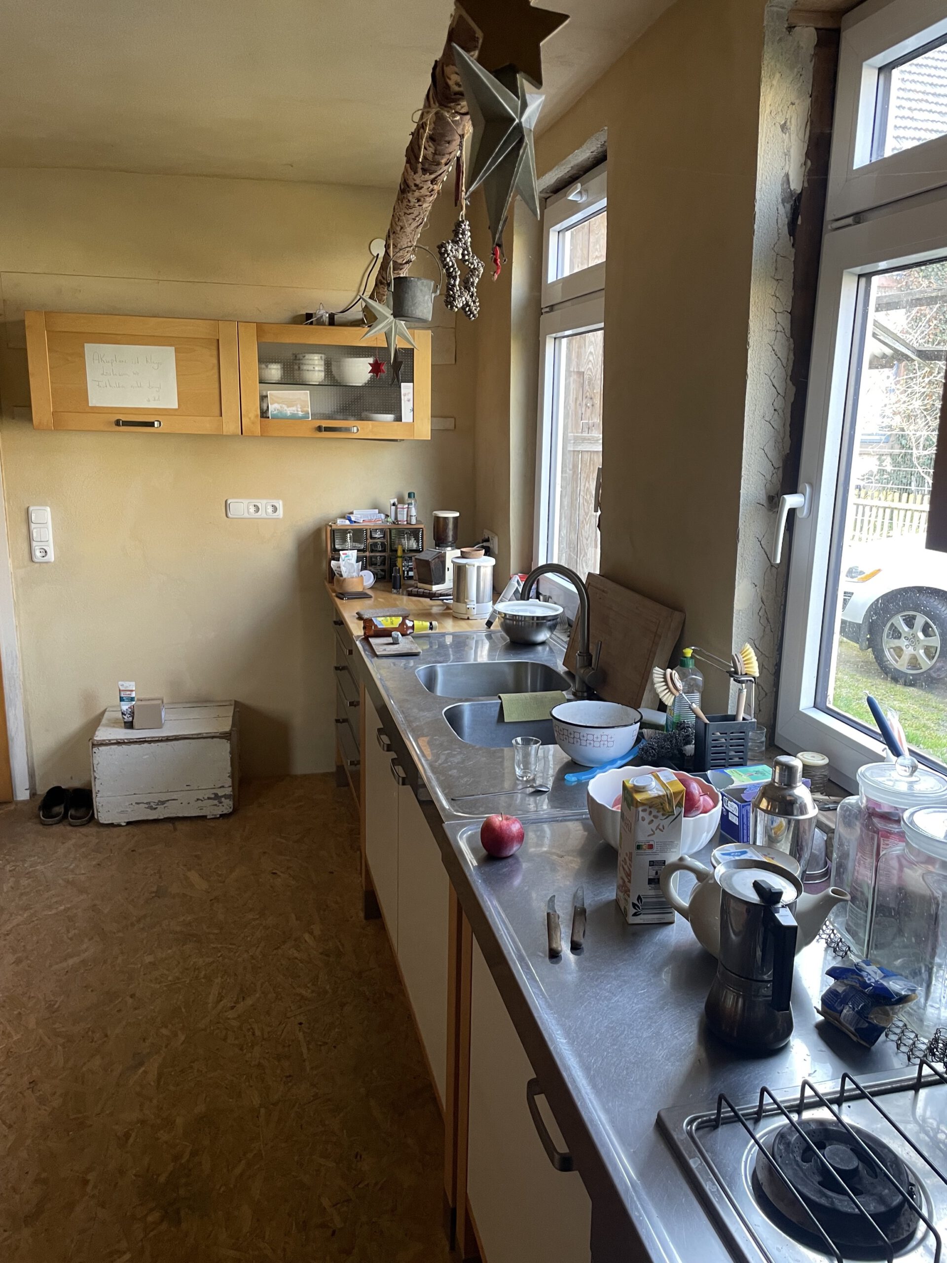 ● Dämmung – Die Hausrückwand und die Stirnseite sind neu mit Lehm verputzt und dann mit 10cm SteicoFlex Holzfaserplatten gedämmt. Winddicht mit Klimafolie verschlossen und mit Lärche Boden-Deckelschalung beplankt. Alle Fußböden und waagerechten Hohlräume wurden soweit möglich mit Glasschaumschotter gedämmt. 15 Fenster wurden bereits erneuert, es fehlen jetzt noch 5 Fenster im OG. Dies kann man im Rahmen der Frontfassadendämmung mit einplanen. Die Frontfassade ist noch nicht renoviert. Hier wurde von ein „Wintergarten / Windfang“ geplant. Die Baumaterialien sind bereits vorhanden. Das jetzige Provisorium ist wesentlich kleiner.
