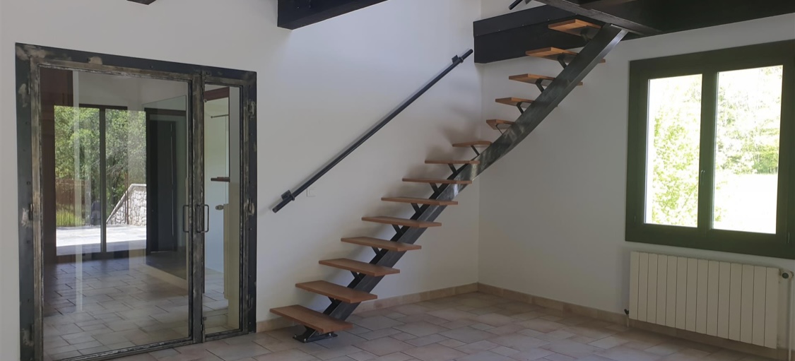 INNENAUSSTATTUNG Das Interieur dieses Hauses wurde mit viel Liebe zum Detail gestaltet. Dabei wurde die rustikale Bauweise aus Sandstein beibehalten, während die Balken bewusst sichtbar und natürlich gehalten wurden. Diese rustikalen Elemente werden ergänzt durch moderne Akzente wie Industrial Design und Glas, die dem Haus eine einzigartige und harmonische Atmosphäre verleihen.