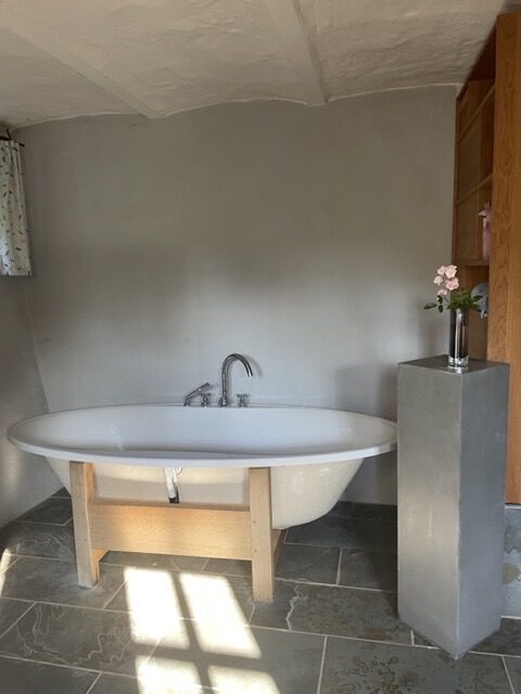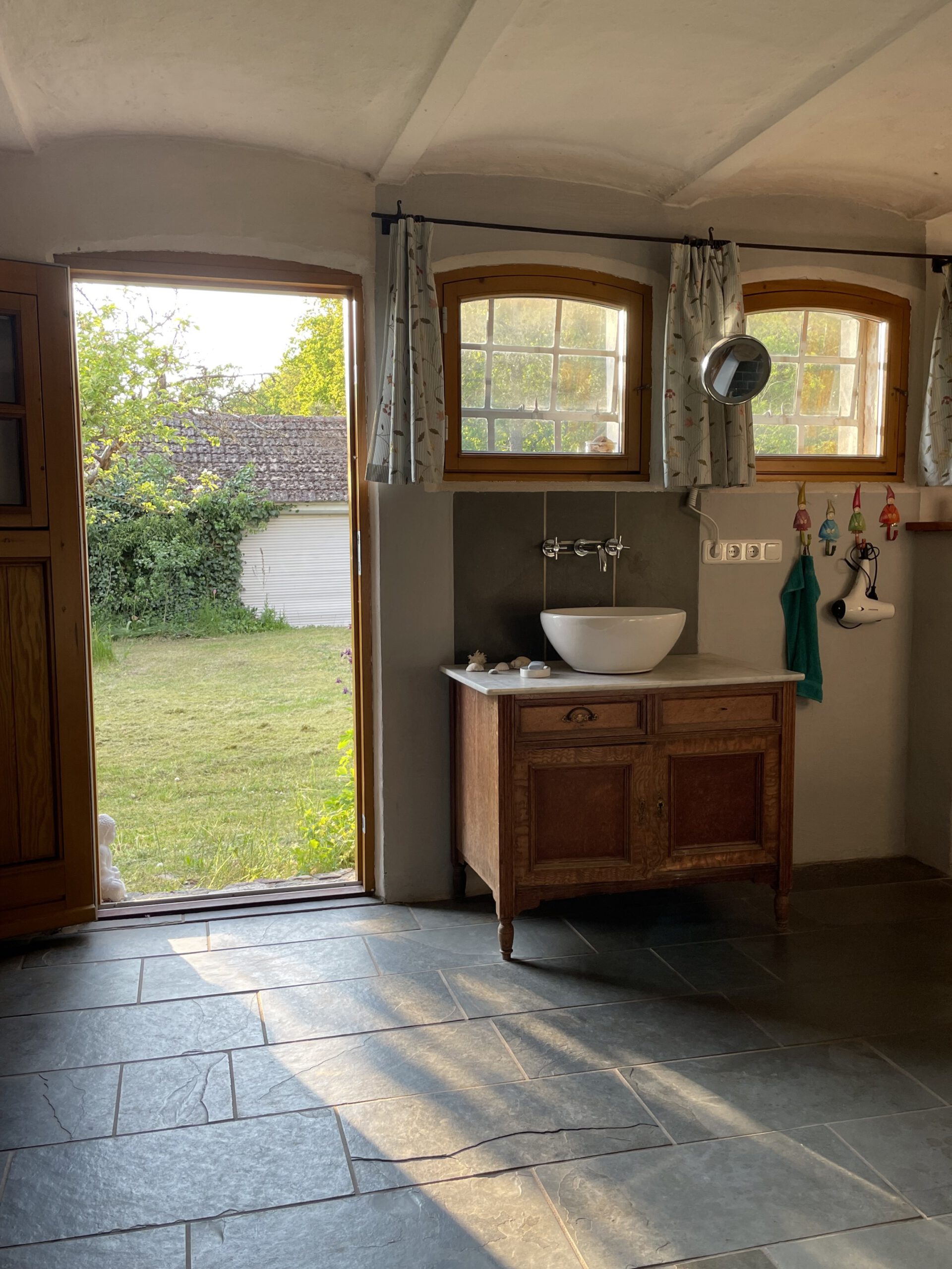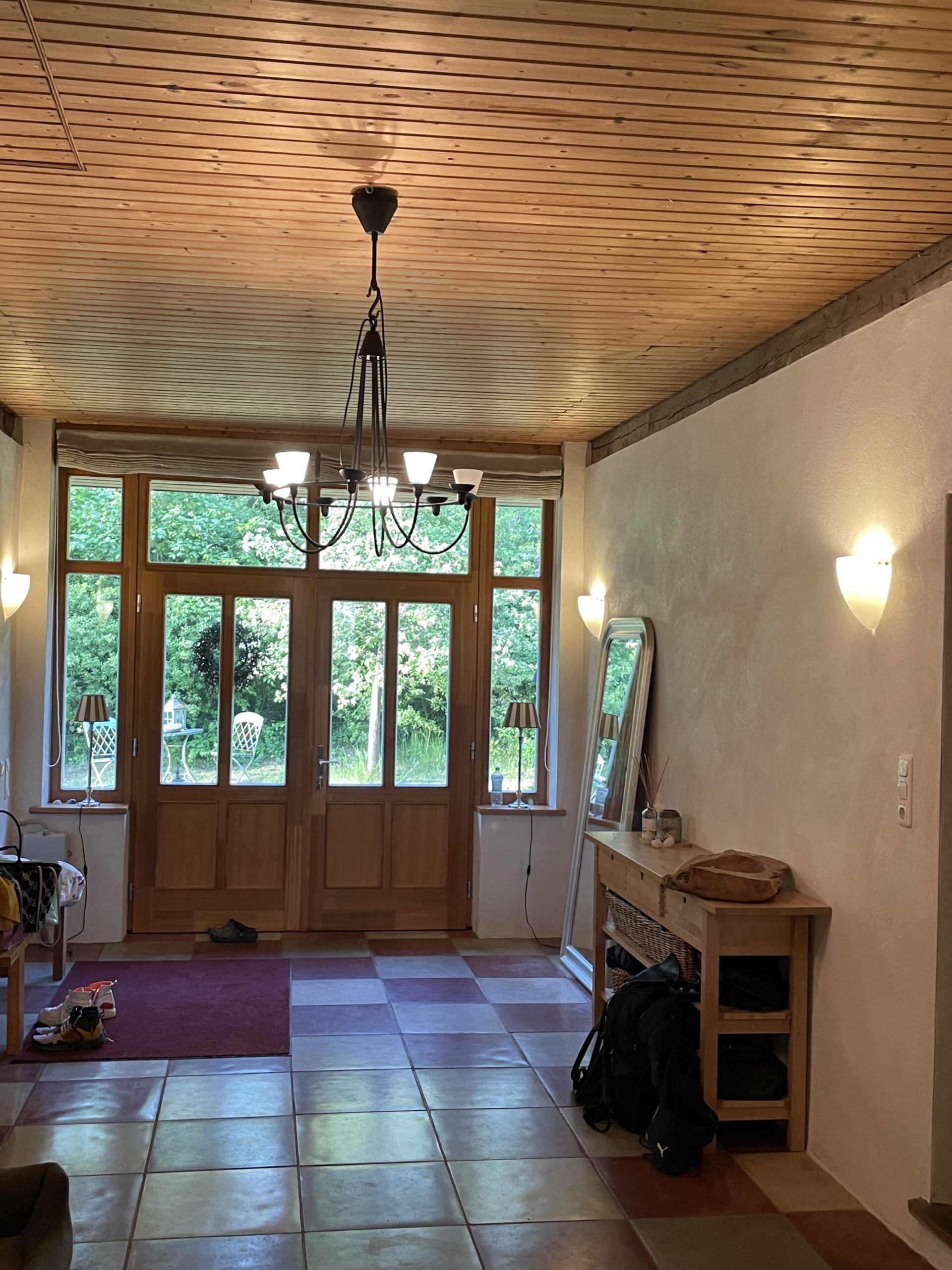 Das sanierte Haupthaus besteht im EG aus einem sehr geräumigen Eingangsbereich mit Fußbodenheizung. Angrenzend ein sehr großes Badezimmer mit Dusche, freistehender Badewanne, WC und Ausgang zum Garten. Ein Saunabereich wäre dort noch möglich.