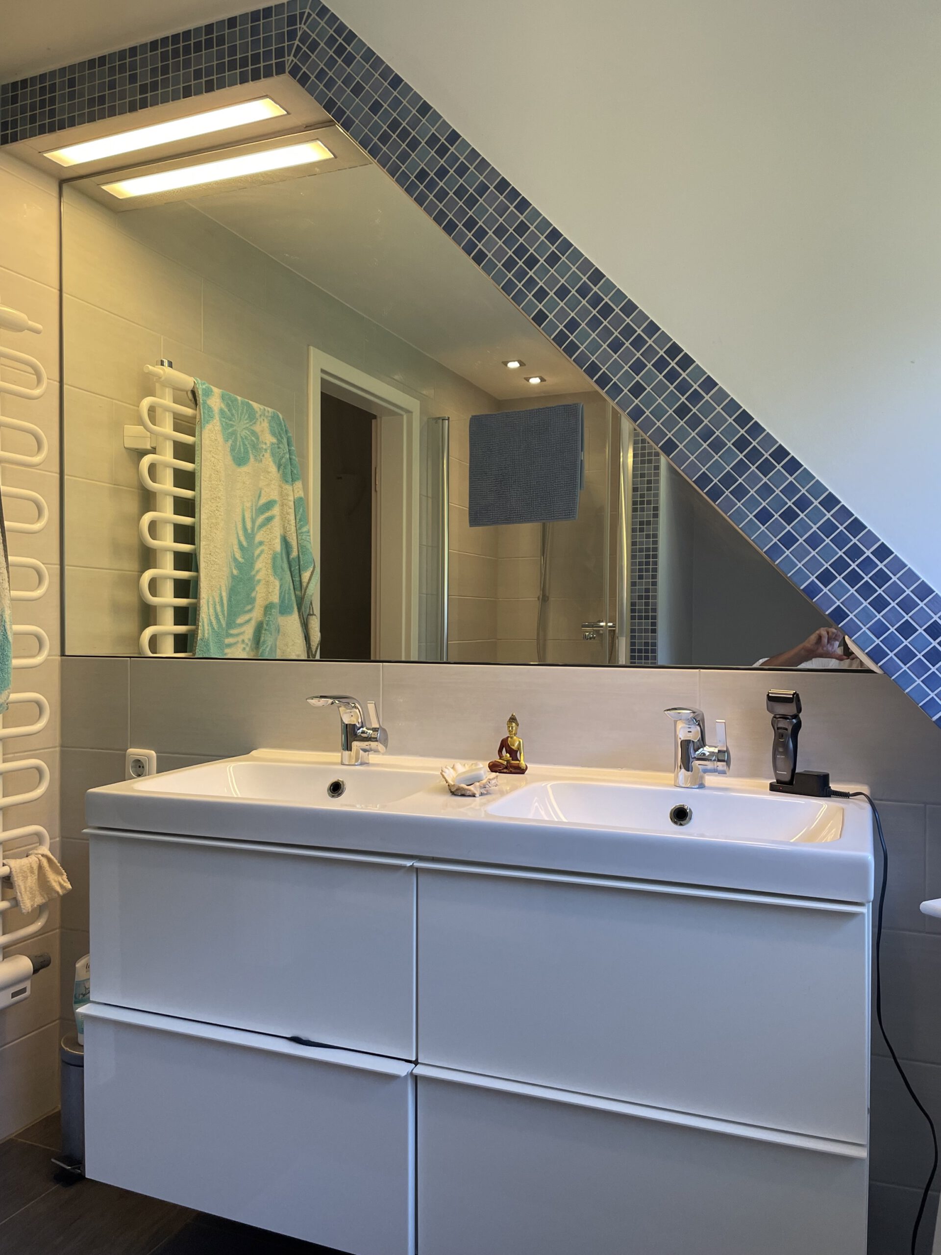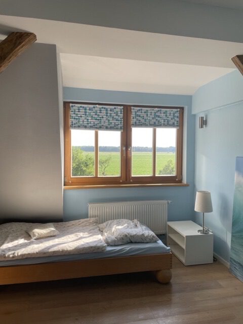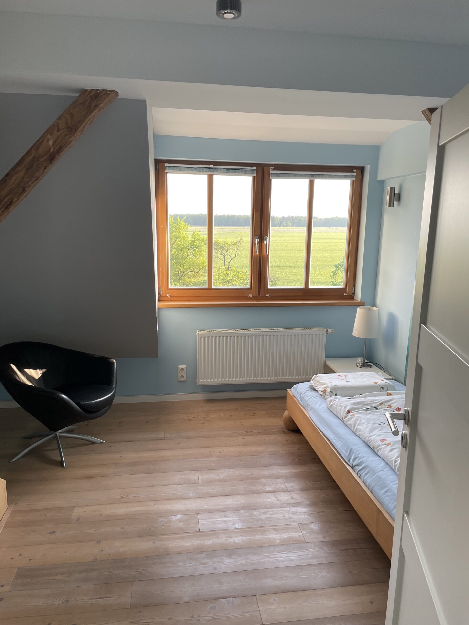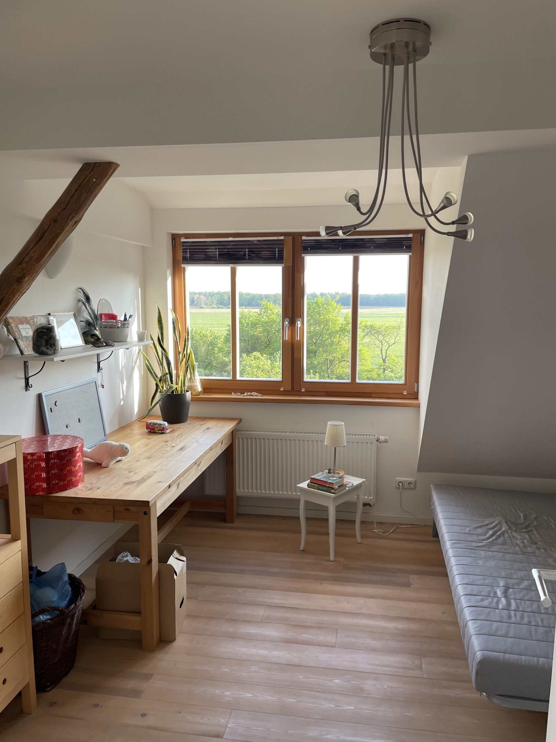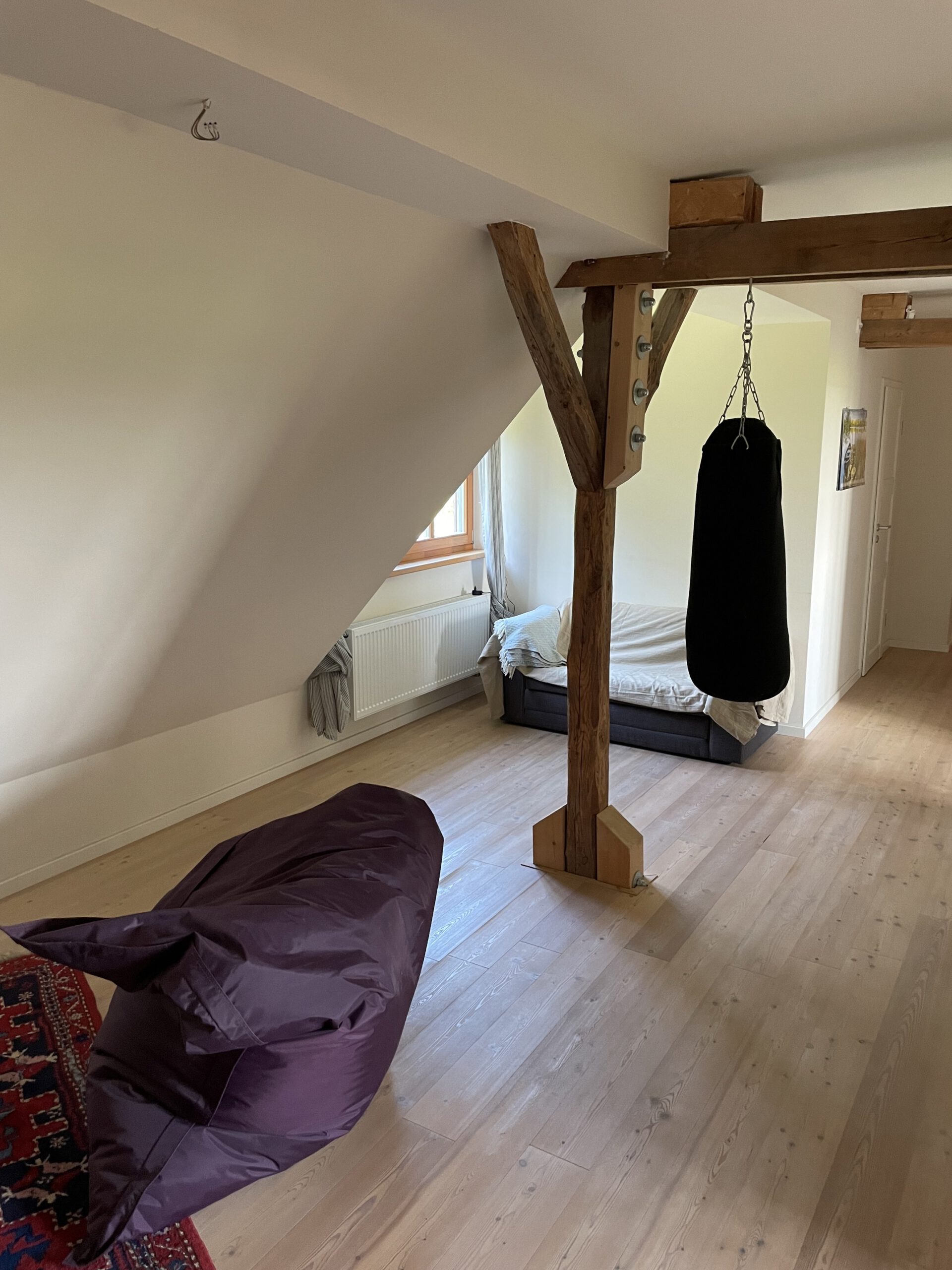 Von diesem Zimmer geht auch die Treppe in 1. OG mit 4 weiteren Schlafzimmern (Kinderzimmer), 1 Duschbad, 1 separates WC, Abstellkammer, derzeit genutzt als begehbarer Kleiderschrank, ein offener Bereich am Ende des Flures. In all diesen Räumen liegt Holzboden aus Lärche mit extrem hoher Trittschalldämmung. Davon abgehend ein weiterer großer, fast fertiggestellter Raum, der multifunktional genutzt werden kann.