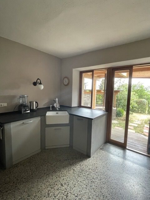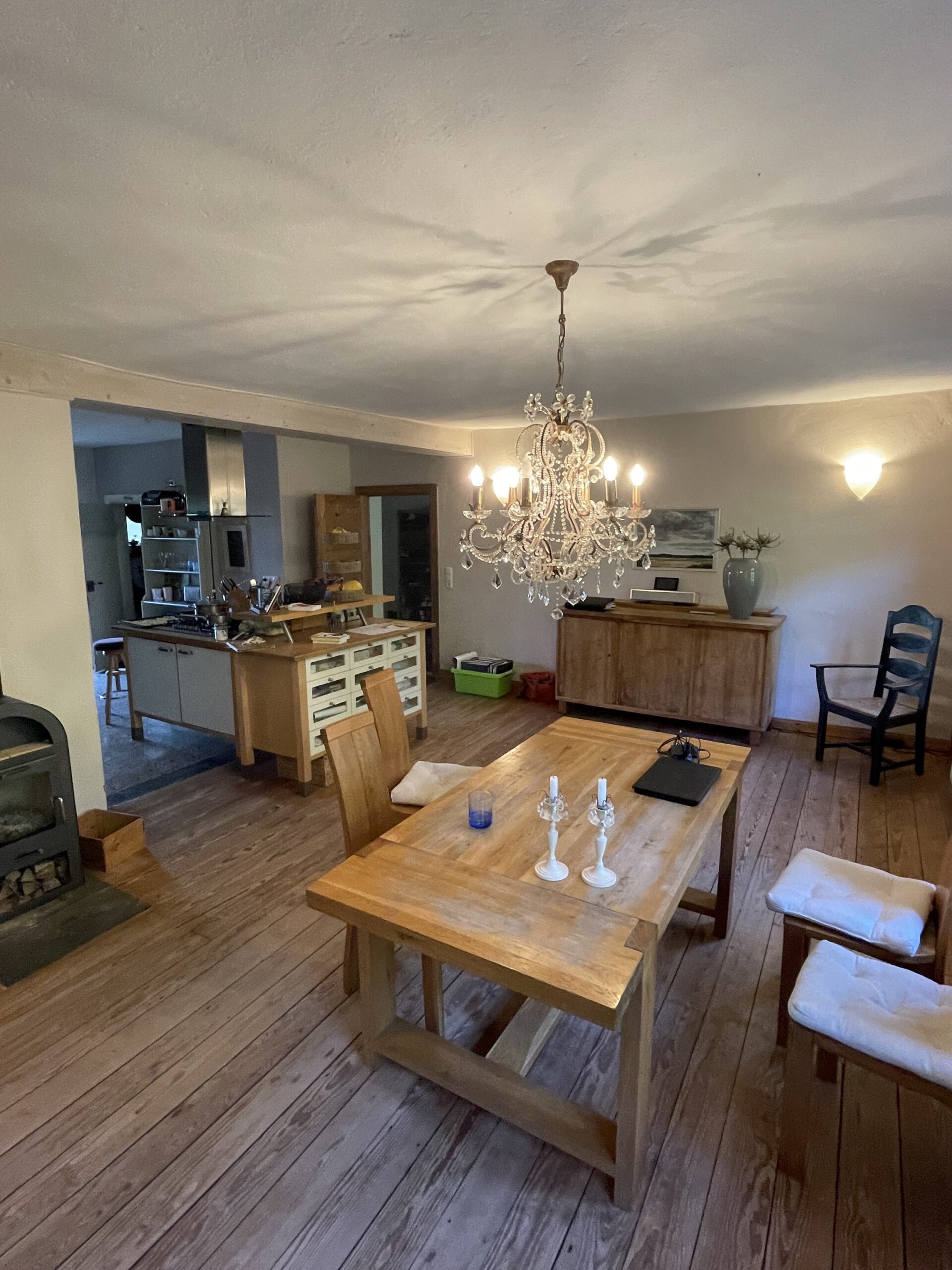 Von dem Eingangsbereich geht es auch zu dem zentralen Ort im Haus. Wohn-Esszimmer mit Kaminofen, offener Küche mit direktem Zugang zur Terrasse und zum Garten mit Outdoorküche.