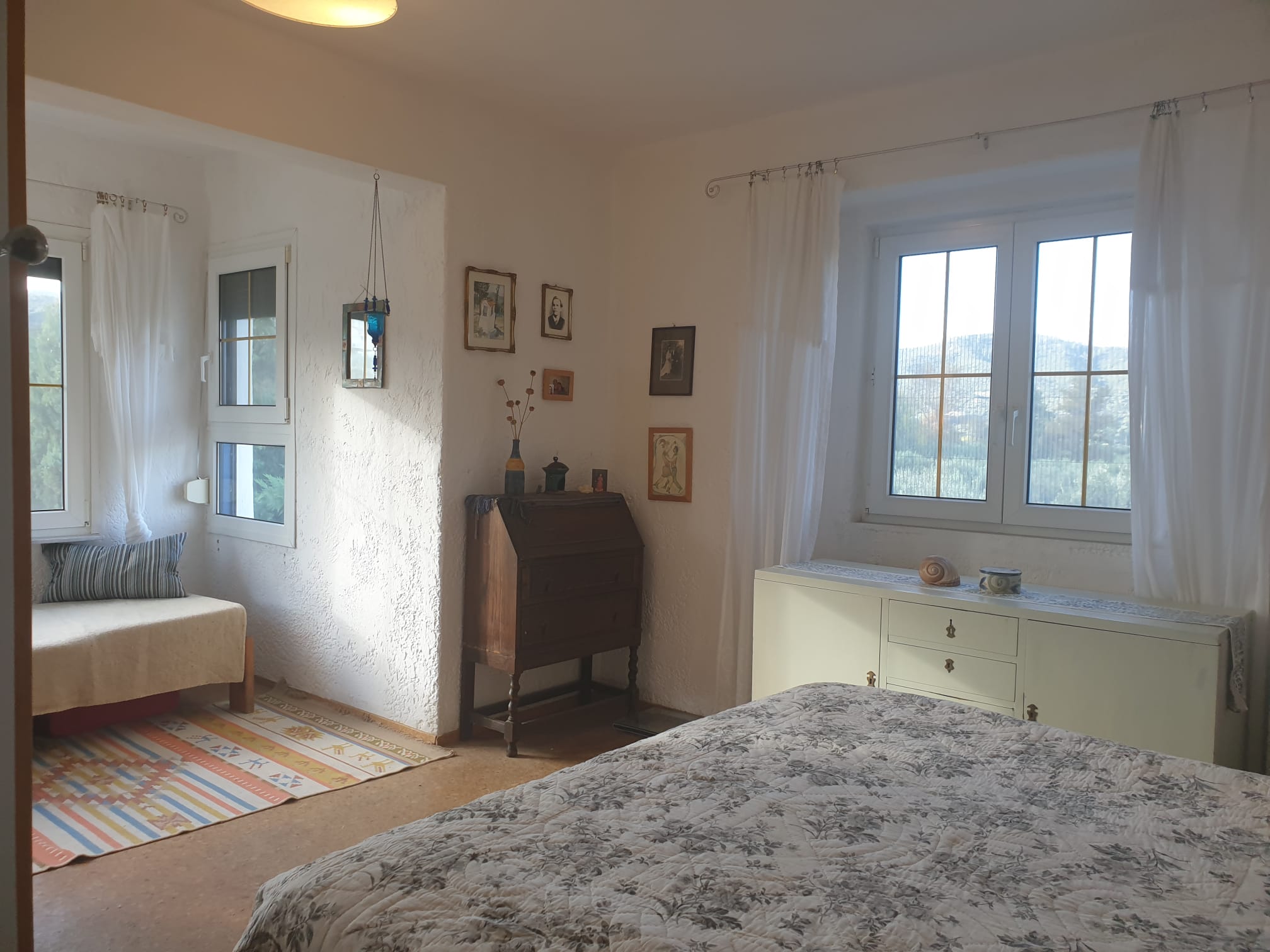 Sehr großer Wohn-Essbereich mit hohen Decken und offener Küche, Kaminofen und Ostbalkon, 2 Schlafzimmer mit Blick auf die grün bewaldeten Hügel, Bad mit Fenster, Dusche und WC. Speisekammer, HWR.